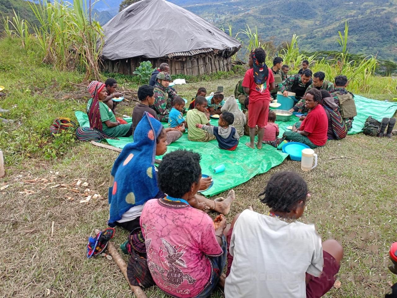 SINAK , SHI – Ada beragam cara untuk berkomunikasi sosial sekaligus berbagi kasih dengan sesama, Salah satunya seperti yang dilakukan oleh personel TNI yang tengah bertugas di pedalaman Papua. Yah, para personel TNI dari Satgas Mobile Yonif 323 Buaya Putih Kostrad khususnya dari TK Pintu Jawa melakukan pendekatan sosial sekaligus berbagi kasih dengan masyarakat pedalaman Papua, melalui kegiatan acara makan siang bersama masyarakat. Acara tersebut berlangsung di Kampung Megeabume yang bertempat di halaman TK Pintu Jawa, Distrik Sinak, Kabupaten Puncak, Papua Tengah, Rabu (29/01/2025).