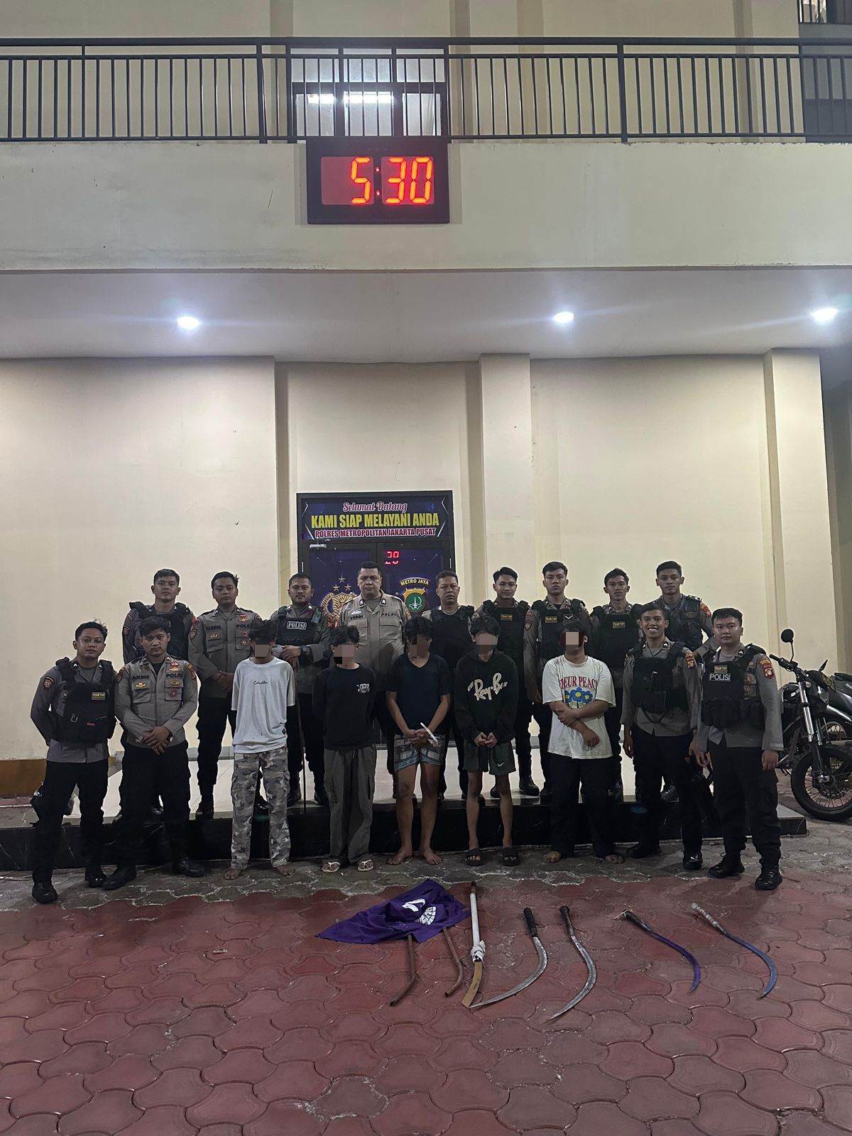 Dalam aksi tersebut, polisi mengamankan lima pelaku berikut barang bukti berupa lima buah celurit dan dua gagang besi yang digunakan untuk menyerang. Para pelaku yakni AR (21), RRS (19), MA (16), NAR (18), dan RD (17), semuanya warga Matraman Jaya.