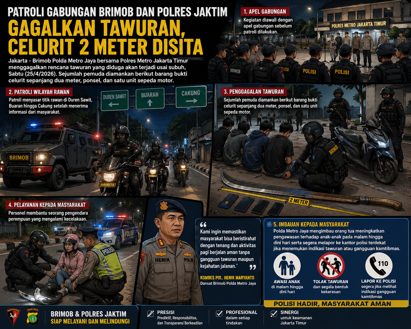 Dansat Brimob Polda Metro Jaya Kombes Pol. Henik Maryanto mengatakan patroli preventif terus digencarkan, khususnya pada jam rawan dini hari. “Kami ingin memastikan masyarakat bisa beristirahat dengan tenang dan aktivitas pagi berjalan aman tanpa gangguan tawuran maupun kejahatan jalanan,” ujarnya.